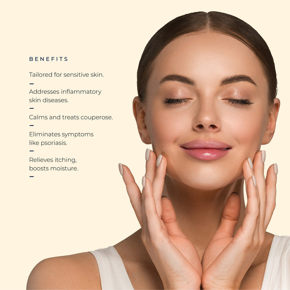 This line is an effective, therapeutic product designed to calm and treat couperose and sensitive skin. It helps in alleviating symptoms of inflammatory skin diseases, such as psoriasis, seborrhea, atopic dermatitis, and rosacea.