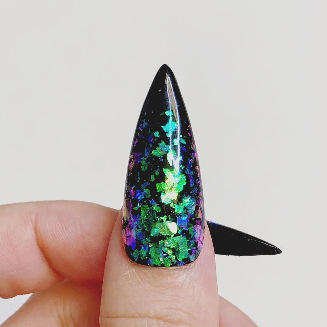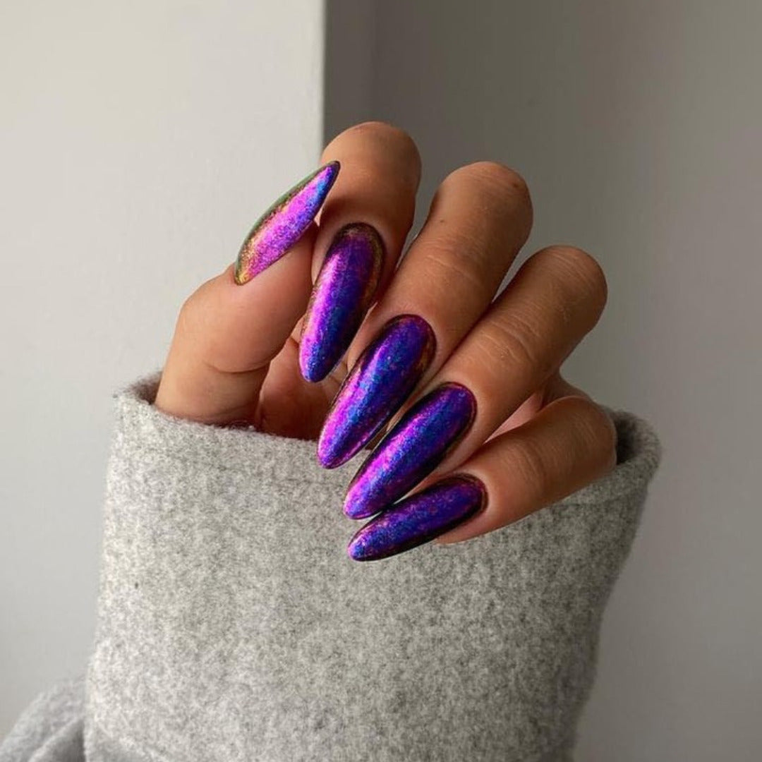 The Transparent Chameleon Chrome Powder is the ultimate tool for multi-tonal nail art. This fine pigment offers a high-clarity color shift, providing a shifting "oil slick" effect that remains partially transparent, making it ideal for layering over complex art or colored bases.